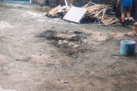 Furnace Demolition The demolition was fairly straightforward, being a reversal of the construction phase. The pot had developed a small leak about halfway down the wall, and the glass had flowed onto the siege and down into the firepit, where it had combined with the partially-melted grate, some nails from the burnt wooden planks, and charcoal and ash to produce a few lumps of this conglomerate. After the paving slabs had been removed, the area was purposely kicked and scuffed to simulate natural weathering, producing an indistinct area with some scattered sand, charcoal and small lumps of glass. |
