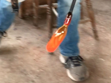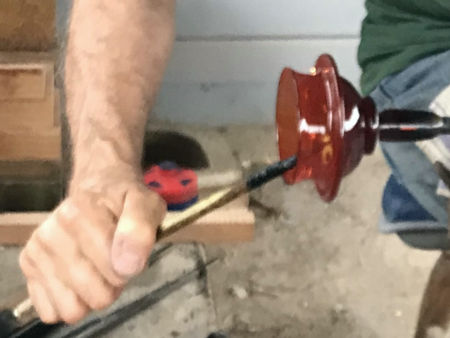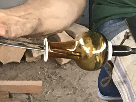 Putting the fold in the wall: The jacks create the sharp bulge in the wall and the wooden board presses both halves together. Opening out the bowl: This is done with a wooden stick. It is kinder to the glass than the metal jacks: it does not mark the glass and it cools the glass more slowly. The flames are from the burning beeswax used to lubricate the jacks and from the burning wood. |