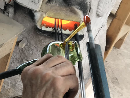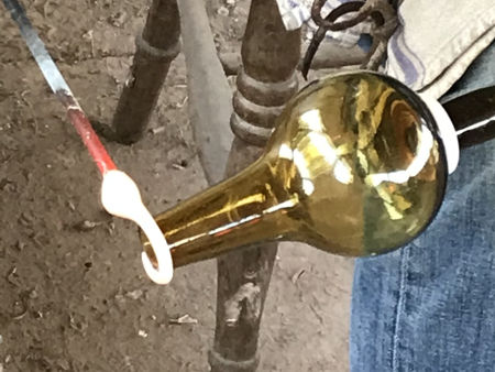 Foot and Rim: White glass is trailed on and shaped to make the foot. The bottle is blown out and puntied. The rim trail (lip-wrap) is added and the rim is opened out. Handles: The glass is shaped with pincers to create the ribs (see photos of second handle). It is then pressed against the shoulder, stretched, stuck under the rim, and cast off. Finally, it is shaped with a stick. |
