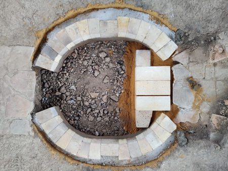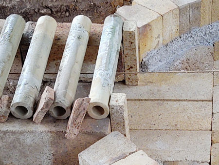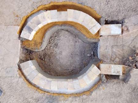To build the firepit walls we used cut-down arch bricks set on a layer of builders sand over a layer of hardcore, all supported by a daub retaining wall. This wall was repositioned to be under the bricks to allow room for the floor of the firepit. In its turn, the sloping floor was built using hardcore and a layer of sand, on which were set the bricks. The gaps between the floor and the walls were filled with castable refractory concrete rated to withstand 1600°C. The concrete also held the walls in place. We made the lower stokehole 9" wide, the floor sloping to 5" deep, the inner, parallel-walled section 21" long and the outer, flaring section 9" long, flaring to 18" wide. We lined it with sillimanite bricks, supporting them at the back with sand and Roman tile fragments held in place with daub, and underneath with castable concrete in what were to be the hot areas and ordinary sand/cement mortar in the cool areas. The upper stokehole is 13.5" wide, and the tunnel is x18" long and 9.5" high from the top of the bricks. The tunnel construction is described on this page. We made the grate under the tunnel from the ceramic fire bars which had previously been used as the pot support bars in the IFoG furnace, spacing them 1" apart with sillimanite brick offcuts. Three stainless steel bars from the previous grate made the outer grate. We spaced them 1.5" apart and set them into a short daub wall on each side as before. The grate was made so the fire bars would be easily removable, and was 5.5" above the stokehole floor to make raking out ash an easy task. It took us fourteen days to rebuild the firepit and lower stokehole. It should be a far more durable structure, and we expect it to last for several years and to withstand many repeat firings. |