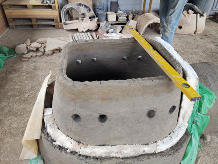 Above the firepit we spread two sheets of plastic. This was to allow for movement of the furnace walls due to shrinking on drying. A bucket on its side would be the form for the stoke hole opening in the wall. We started by building the inner wall first, taking care to keep it about 2” thick. We reused the plywood form from the IFoG Furnace for the ash hole, and to keep the angle of the wall correct we made a simple measuring device from some scrap wood. In order to completely encase the ceramic fibre, every opening into the furnace had to be lined with a 2" thickness of daub which joined the inner wall to the outer wall. This can be seen at the stokehole and the ash hole, where we added flanges which became the starting points for the outer wall, and removed the bucket and the form. This allowed us to start on the tunnel, which we built in tandem with the inner wall. When the inner wall reached gathering hole floor height we set it to the correct shape using a cardboard form and continued to work on the tunnel, building the outer wall and adding the layer of ceramic fibre. The trowel was used to keep the inside surface of the outer wall reasonably flat and to regulate the wall thickness. We built the outer wall, again about 2” thick, adding the ceramic fibre as we went. Before we built it up too much we drilled the holes for the ceramic pot support bars and added the small rounded shelves for extra support on the inside of the furnace wall. |