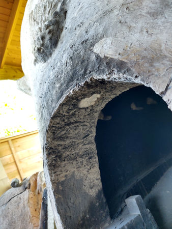 After drying out the furnace and following its shrinkage, particularly vertical shrinkage, we were concerned that the tunnel did not provide enough clearance for the fire. We decided to move it upwards by about 1.5" so it was just below the Phoenix plaque. The first job was to make a better foundation for the tunnel to sit on, which we did by building up the level behind the lower stokehole bricks with tiles and daub. After marking the new height of the the tunnel on the furnace wall we removed the daub using a hammer and wood chisel, exposing a small portion of ceramic fibre blanket in the process. We repaired and smoothed over the surface with daub (not photographed) and replaced the tunnel on two 1" layers of ceramic fibre blanket. The weight of the tunnel compressed the fibre so the the tunnel sat at the correct height. |