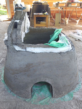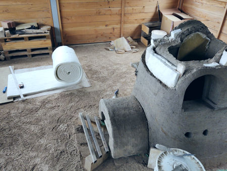 Building the upper half of the furnace was more complicated, but used less daub than building the lower half. There were ten holes, two shelves and two gathering hole floors to consider. We had premade the forms for the gathering and pipe warming holes, and the top holes were cut-down 3” cardboard tubes. Note that the flanges on the inner part of the large gathering holes were built in as part of the forms, and they acted as stops for the collars and stoppers to sit against. The gathering hole forms doubled as the forms for the collars and stoppers, and these were made after the gathering holes had been formed. Each hole had to be isolated from the ceramic fibre blanket by lining it with up to 2” of daub. This led to some awkward shapes for the cavities and some careful cutting of odd pieces of blanket. Before placing the forms in position, we covered each one with a layer of clingfilm, which acted as a separator and allowed us to extract the forms when the daub had hardened sufficiently. The shelves below the small gathering holes and pipe warming holes were added to the wall as it was built, and were fully keyed in and integrated. The vaulted roof in particular had to be built gradually, allowing enough time for the built part to harden before adding more daub. Even so, it had to be adjusted several times by manipulating it from below. Note that we finished building the outer roof whilst we were drying the furnace. See photos on this page. The two sets of slots in the large gathering hole were cut using a hacksaw blade. A slot was also cut into each of the shelves in front of the pipe warming holes to allow a length of metal bar with rounded slots cut into it to support the irons. We call this a 'piglet'! The Phoenix was sculpted by David. A plaster mould was taken of the original, and copies in daub generated from the mould were stuck to the furnace walls whilst they were still damp. |
