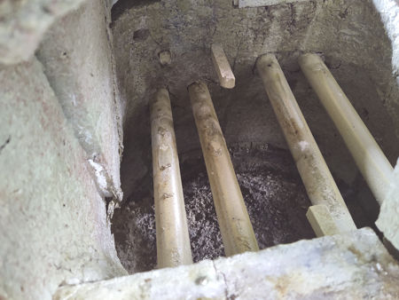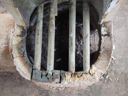 After removing the ceramic fibre, we could see the condition of the furnace. The 2020 and 2021 firings had taken their toll. There were more cracks, particularly visible in the roof section, which did not have its insulating layer of ceramic fibre on the hot face. The wall above the stoke hole had moved away from the gathering hole, only being supported by the tie rod. The pot support bars were glazed and very slightly bent. They were to be reused as the grate in the stokehole for the new furnace. The outer layer of ceramic fibre had created a partially-fired structure. Due to the low firing temperature (around 600°C - 700°C), the surface of the daub wall had turned a reddish orange colour, the chopped hay had burnt out, and the wall had become brittle. The ceramic fibre we had used to fill the cracks in the hot face had mainly survived intact. The furnace came apart very easily, although it broke into smaller pieces around the gathering holes and the holes for the pot support bars. Comparing the cross-sections of the wall with those of the 2019 disassembly (see this page), the extra cracks showed that the subsequent firings had caused the furnace to undergo further shrinkage. The firepit had been subjected to a lot of heat, and this showed in the blackening and cracking of the tiles and the fusing of a glass/ash mix to their surface. It clearly needed to be replaced, and that is recorded in the section on Firepit Reconstruction. The stainless steel grate had suffered serious attack: the first and second bars had totally disintegrated, and before Firing Six the second one had to be replaced with one of the others; bars three and four were also badly worn; and the daub bar supports were broken away at the hot end. Re-erecting it was a matter of laying some paving slabs and carefully placing the pieces of superstructure on them. Some areas of the wall had crumbled, notably the areas around the support bar fixings, and could not be included. We covered it with a large plastic bag to preserve it for as long as possible. |