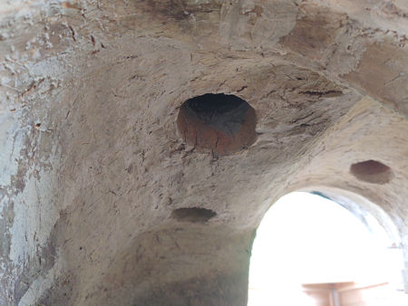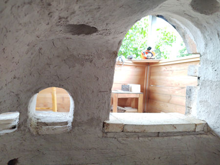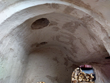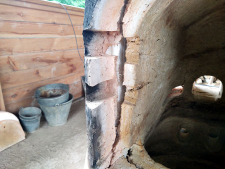 The next morning we were able to assess the consequences of the firing. The firebricks were still hot and the furnace was at 78°C. The inner wall had shrunk in several directions (downwards, inwards at both sides and at the front and back), and had pulled away from the outer wall, leaving large gaps where the two walls had been joined (such as at the gathering holes, etc.). It looked worse than it really was, as although there were some small and larger cracks in the daub, particularly near the base, the inner wall had not cracked all of the way through. Some cracks appeared in the outer walls, but were not serious. In fact, many of them had been expected, particularly at the top of the furnace, where the wall had been subject to some rather intermittent building. The differential shrinkages of the inner and outer walls led to the opening of gaps in the top hole sections and the creation of steps in the gathering holes. One advantage of having an inner and outer wall separated by a layer of insulation is that no crack will extend from the outer surface (coldface), to the inner hotface, so the integrity of the furnace would not be affected. To repair the cracks in the inner wall, we used a high temperature sealant able to withstand 1300°C (it also made a good cement - we used it to repair some broken collars), and a high temperature filler able to withstand 1200°C. We used daub to repair the cracks in the outer wall, and a combination of daub and high temperature filler to repair the cracks between the walls. |