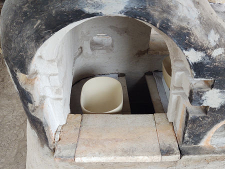 After filling the cracks, we coated the entire hotface (including the tunnel hotface and the thicknesses of the gathering and warming holes) with a zircon silicate slip which dried hard and was able to withstand 1750°C. This would protect the hotface from attack both from the glass and from the furnace atmosphere. We also coated the backs of the collars and stoppers. In the photographs, the grey lines standing out from the white zircon silicate coating are the areas that we filled. We filled the steps in the gathering hole bases with ceramic fibre blanket, over which we placed the sillimanite tiles to form the floor. To give the ceramic fibre a hard shell, we painted it with zircon silicate slip. We replaced the shelf supports and fitted the shelves. The shelves were made from 16mm thick kiln batts which we cut to shape following the cardboard templates we had made. After fitting the shelves, we sealed them against the wall with daub. We also put a layer of ceramic fibre cloth on top of the shelves to help protect them. For the main pots, we used oval pots which held about 4 kg of glass, and to set them at the correct height we used old HTI arch bricks together with some daub 'sausages'. Finally, we put spacers made from fire brick offcuts each side of the firebars in the stoke hole. They would stop the bars from moving too much. |